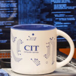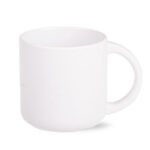 An advertising mug with the white, matt glaze on the outside and the colorful, glossy inside. Straight, cylindrical sides allow for the application of a large and complex advertising print. This design features a unique handle shape. The mug is very capacious.