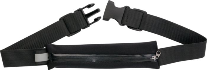 Neoprene, zippered waist bag with adjustable rubber band at both sides (2 x 27 cm) and black plastic closure. The inside of the bag is coated to make it water resistant.