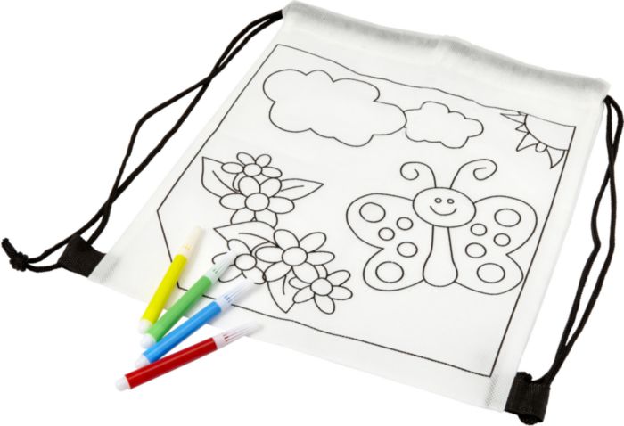 Nonwoven (80 gr/m²) drawstring backpack with design to colour in. Supplied with four felt tip pens.