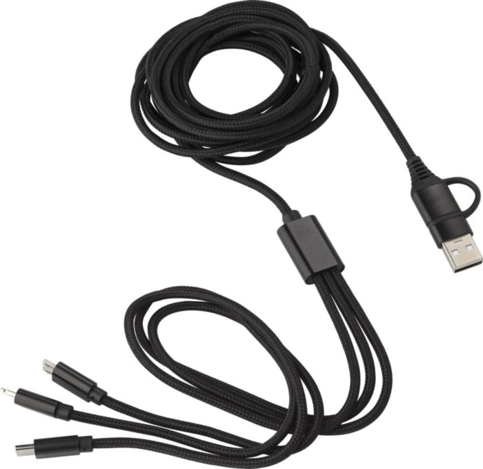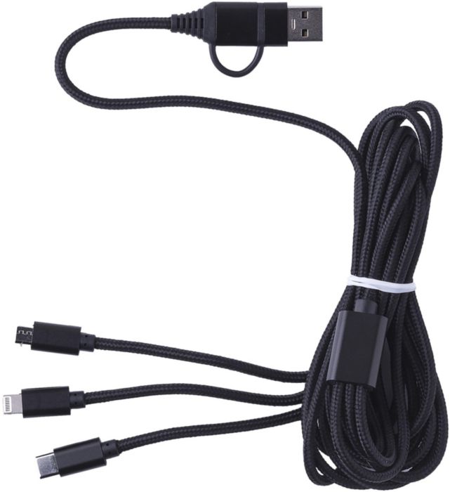 Nylon charging cable. 290cm length, 1.5A speed. A+C Connection, micro, type-c and lightning on two sides. 100% copper wires.