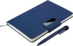 Carton gift set consisting of a recycled aluminium twist ballpen with blue ink and a recycled PU notebook with 80 sheets (70 gsm) lined paper. The notebook includes a ribbon bookmark and metal magnetic closure with gunmetal engraving plate. Both items feature a recycled logo: embossed on the notebook and engraved on the pen.