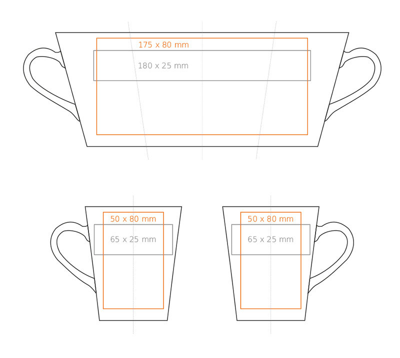 DecorationsTryck på handtaget (max: 5x30 mm); Tryck på insidan (max: 50x20 mm); Tryck på botten, insida (max: ø30 mm); Tryck på bottens utsida (max: ø35 mm); Kantband; Namntryck; Guldtryck; Silvertryck; Termotryck