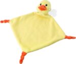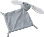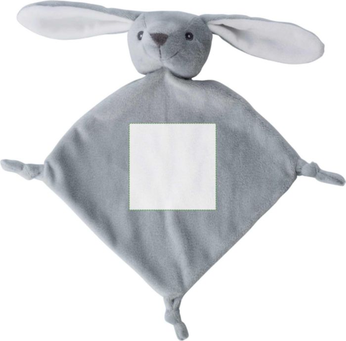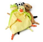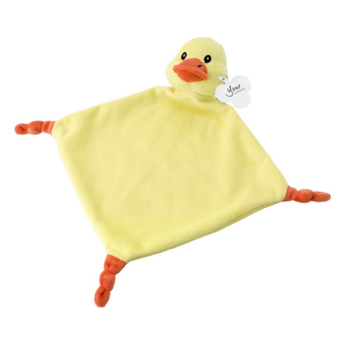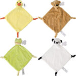 Plush cloth with knots at three corners and an animal head on the fourth corner. Includes a tag for printing.