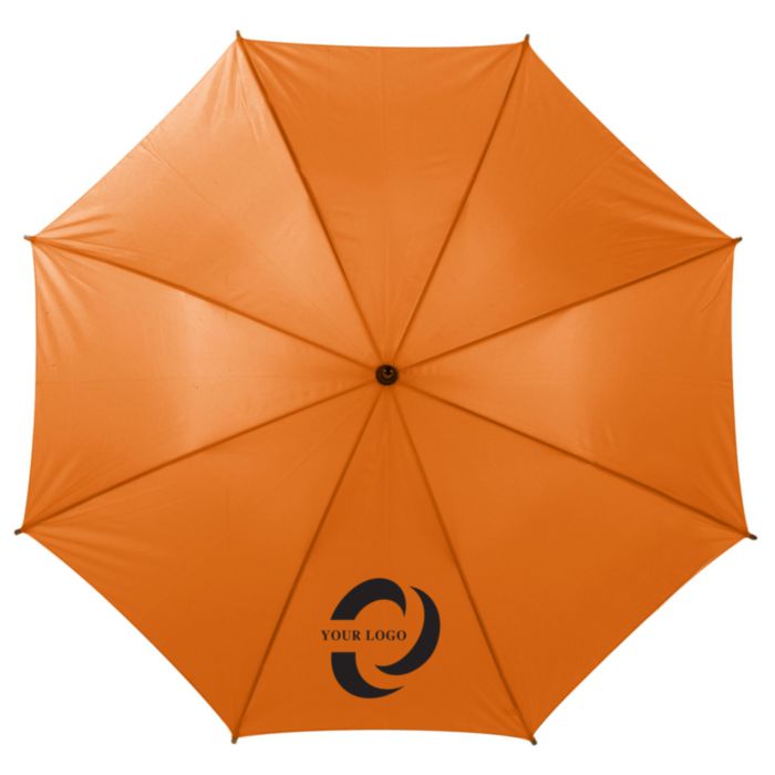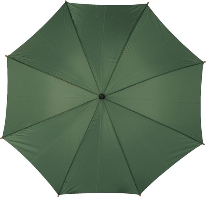 Polyester (190T) automatic umbrella with eight panels. Metal frame and wooden shaft and handle.
