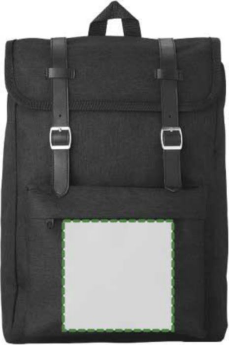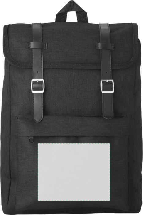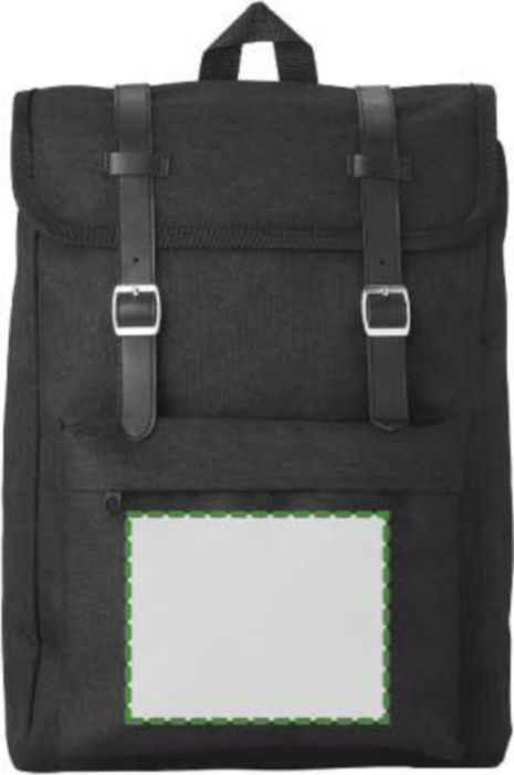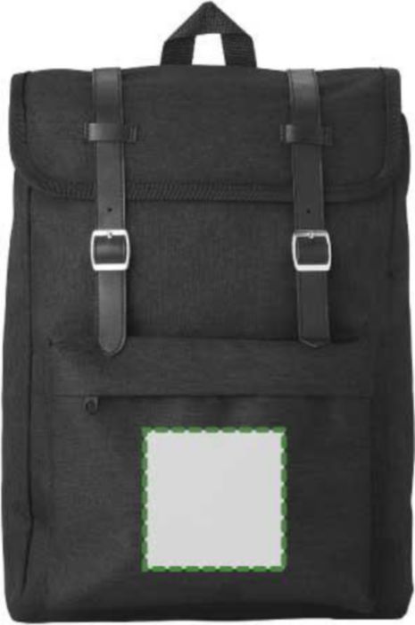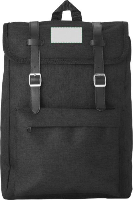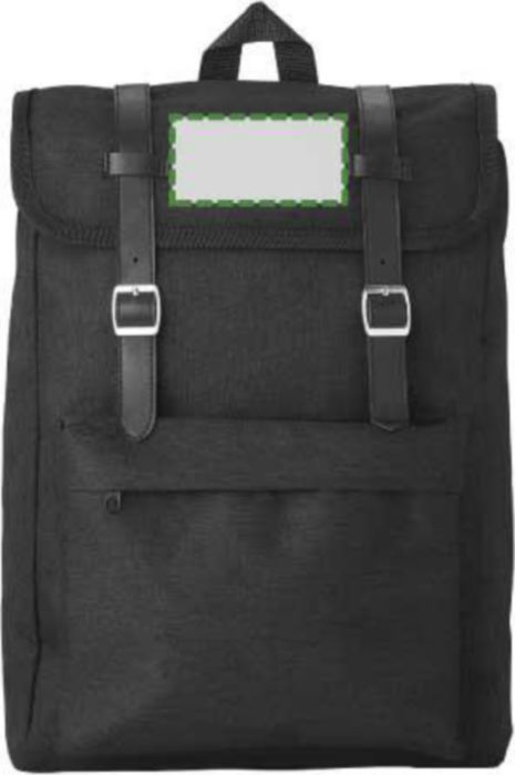 Polyester (300D + 210D) backpack with zippered front pocket. The flap closes with two metal buckles. The back is padded. The shoulder straps are padded and adjustable.