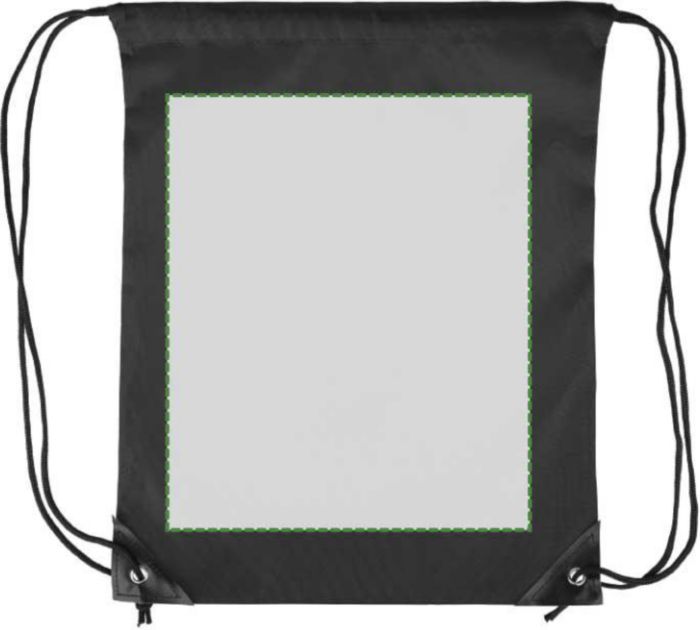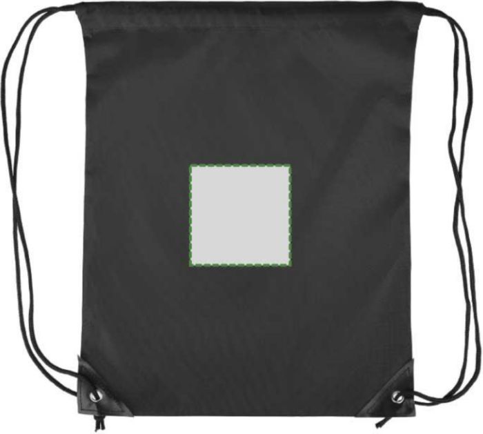Polyester 210D drawstring backpack with two black PU corners on the front and internal sewing. Features a black nylon cord on each side, a pull-cord closure, and one inner compartment. Capacity: 5L. Carrying capacity: 7 kg.