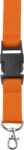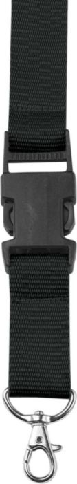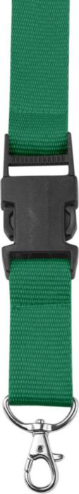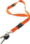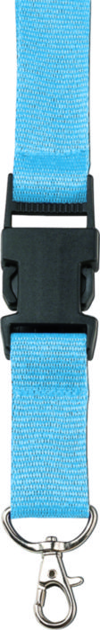Polyester lanyard with plastic safety release clip and metal key holder.