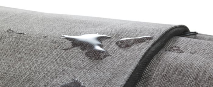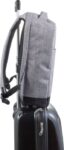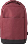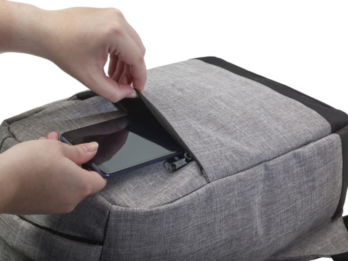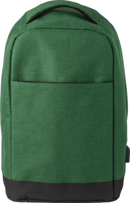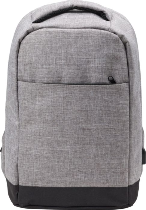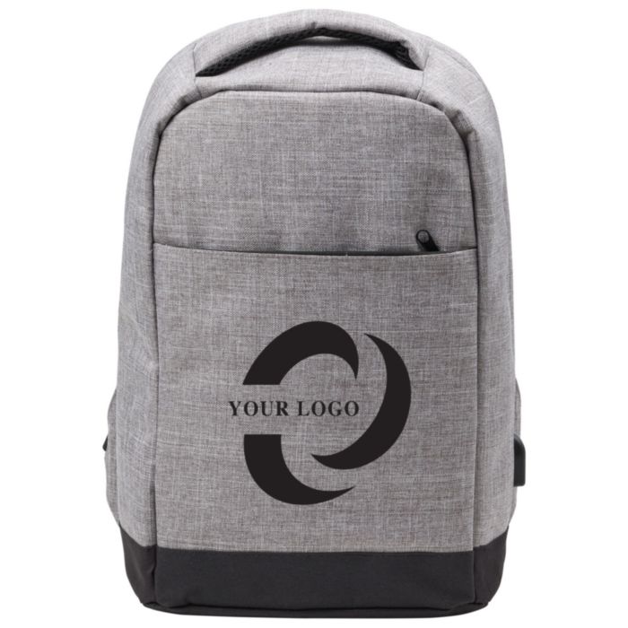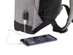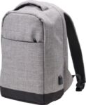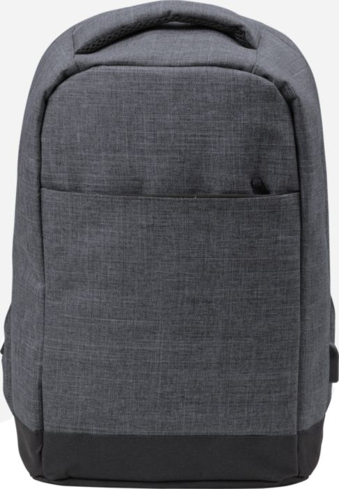 Polyester (600D) anti-theft backpack, with PVC backing. The backpack has a laptop compartment (13 inch), multiple interior pockets including a front pocket with zipper, and a USB port at the side with a cable on the inside.