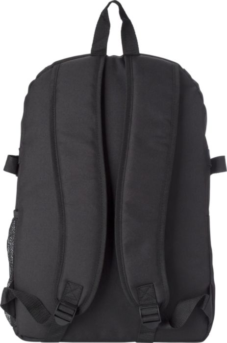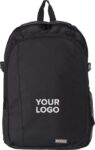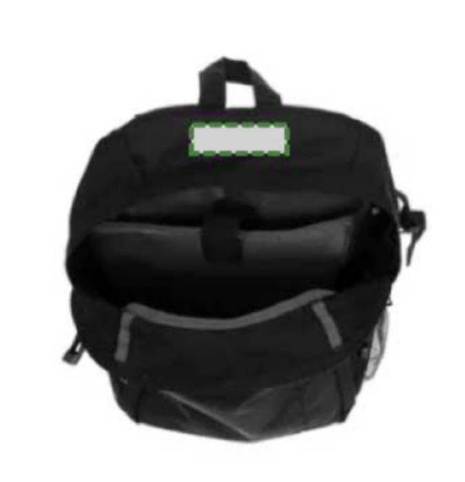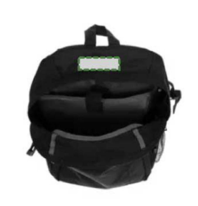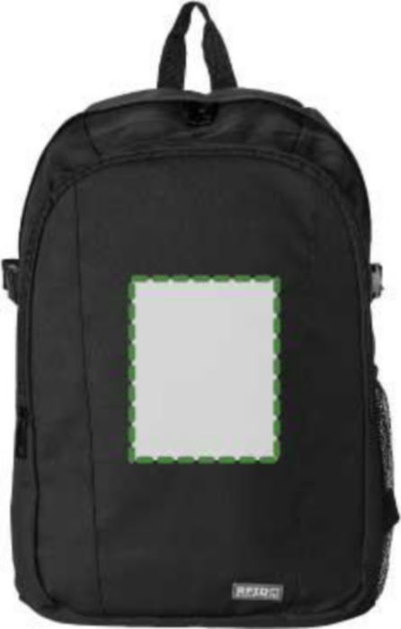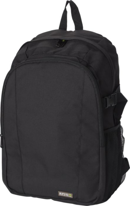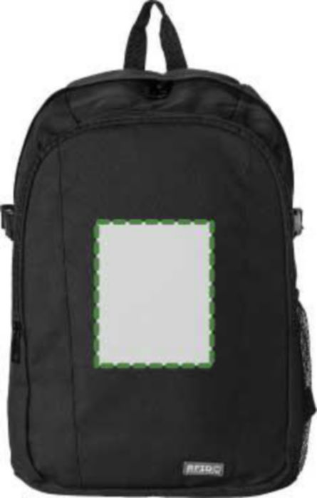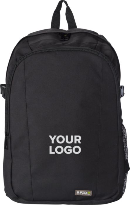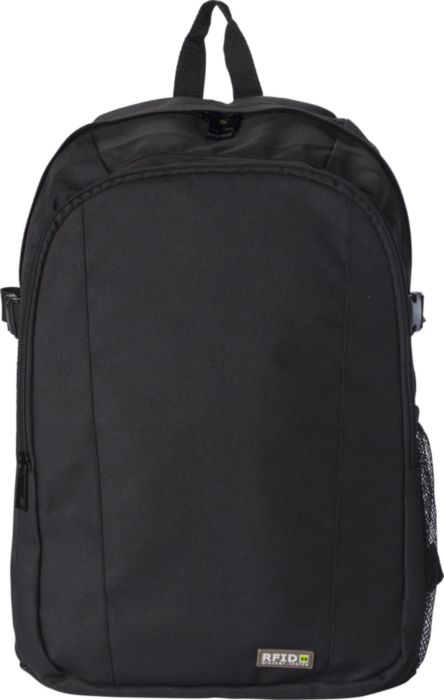 Polyester (600D) backpack with RFID blocker.The front pocket and main compartment have a zipper and several pockets in the interior, with a compartment for a laptop (14 inch). Also has a mesh outer pocket at the side. The straps are padded and adjustable.