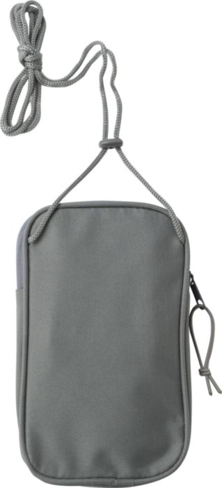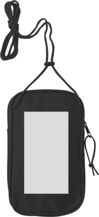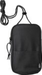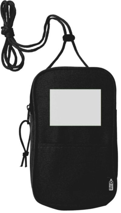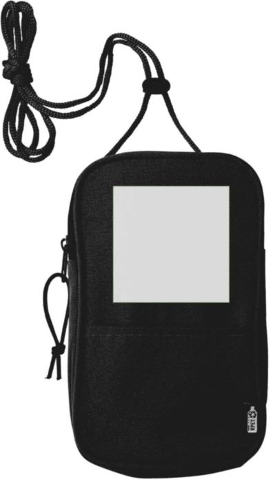 Polyester RPET (600D) cross shoulder bag with adjustable wrist cord. One large compartment with zipper with elastic band and insert pocket. The zipper has an elastic band. With RPET label.