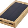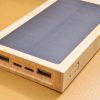 Bamboo solar power bank with a capacity of 10,000 mAh, two USB-A outputs and two Type-C ports for input and output. Features a wireless charger on the back side with a laser-engraved wireless symbol and five indicator lights. The upper side includes a solar panel (6.3 x 12.8 cm). Wireless output: 5V DC/1A (5W), wireless charging distance: 6 mm. Input/Output via cable: DC 5V/2.4A. Equipped with short circuit, overcharge, and over-discharge protection. Includes white 30 cm cable. Individually packaged in a brown cardboard box.