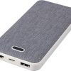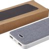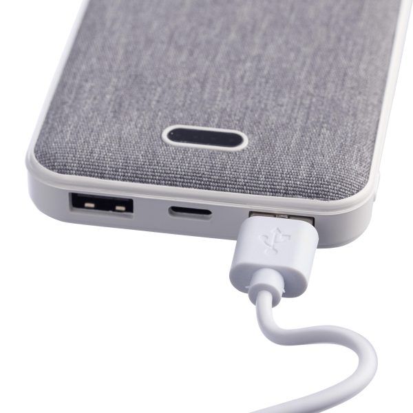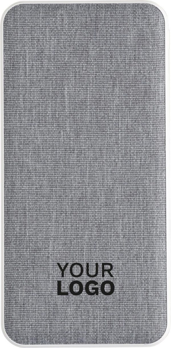 Recycled ABS and rPET power bank with a capacity of 10,000 mAh and a cycle life of at least 500 charges. Equipped with two USB outputs and one Type-C port for both input and output (5V DC/2.4A, 12W). Features a charging indication display and an rPET logo on the top side. Includes white 30 cm charging cable. Individually packaged in a brown cardboard box.