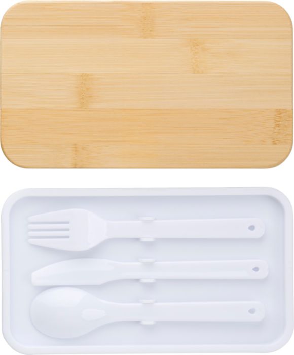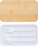 PP double layer lunch box with multiple compartments (2 x 400 ml) and bamboo lid. Including divider and plastic cutlery (spoon, fork, and knife), and elastic band.