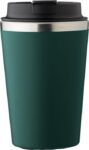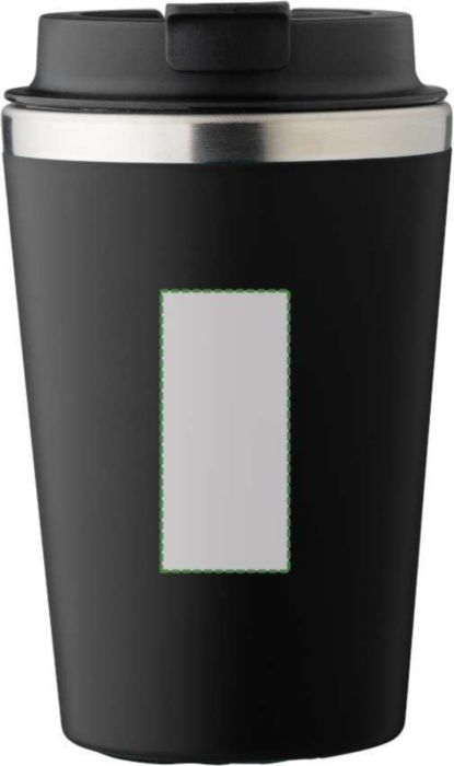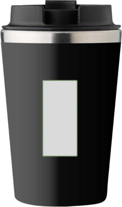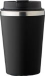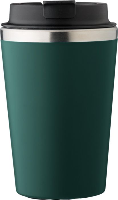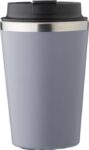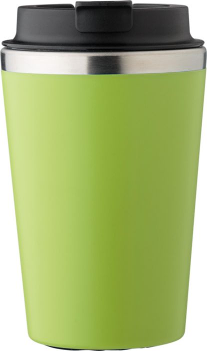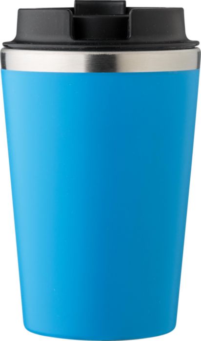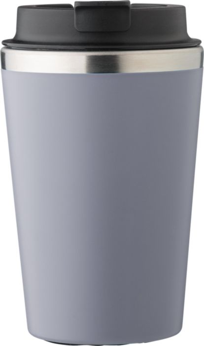 Stainless steel and PP travel mug (350 ml). The PP lid has a silicone closing ring with a foldable closure on top. Individually packaged in a brown cardboard box.