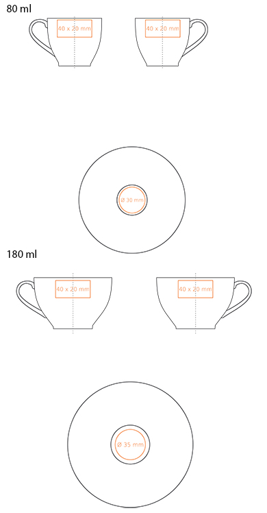 DecorationsTryck på insidan (max: 40x10 mm); Tryck på botten, insida (max: ø20 mm); Tryck på bottens utsida (max: ø25 mm); Tryck på fatet (max: ø30 mm); Tryck på fatet (max: ø35 mm); Dekoration runt äggformad yta