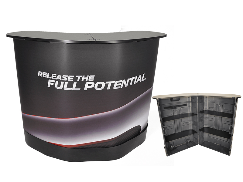 Sturdy promotiondesk with wooden top and 4 shelves. Practical storage possibilities when closed. Promotiondesk Boomerang.