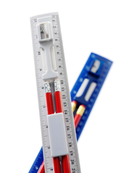 Plastic ruler (30 cm) with two pencils, a plastic sharpener, and eraser.