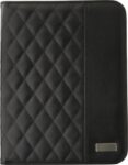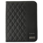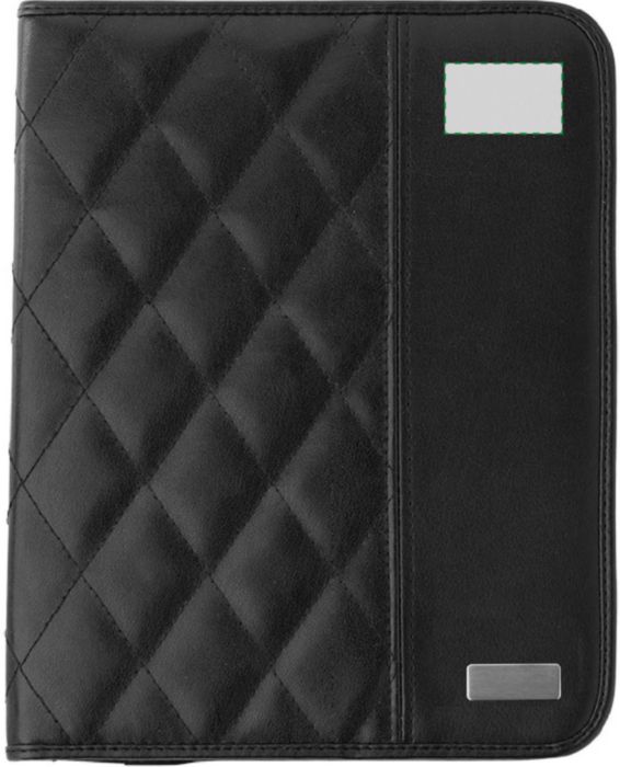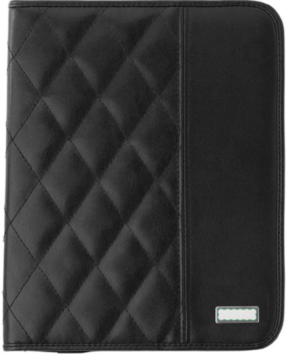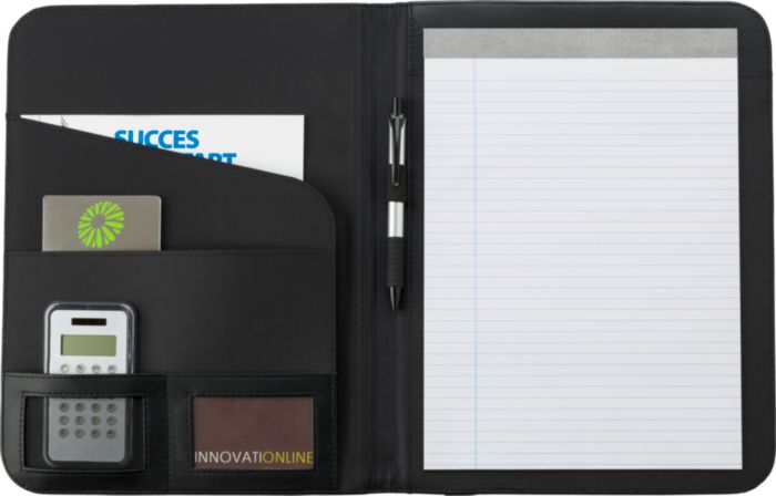 PU padded portfolio (approx. A4), with notepad with 25 lined pages, a mesh pocket for credit cards, multiple other pockets, and an elastic pen loop (pen not included).