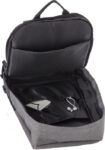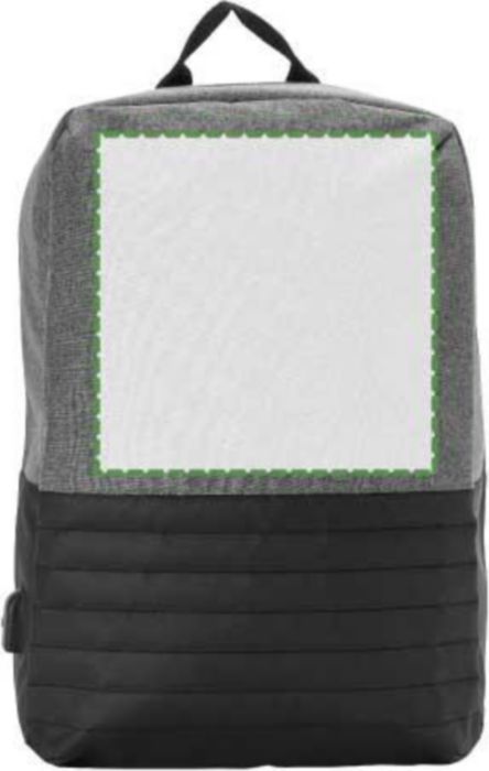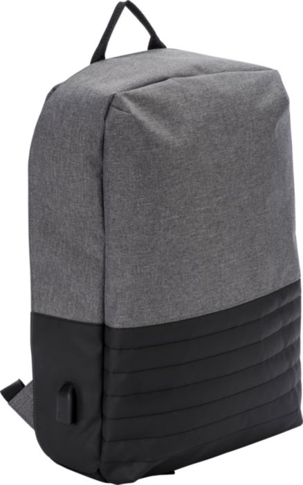 PVC (600D + 300D) anti-theft backpack with adjustable and padded shoulder straps, as well as a padded back. Large main compartment with a zipper and padded laptop compartment (15 inch). USB port on the exterior, with a cable on the interior.