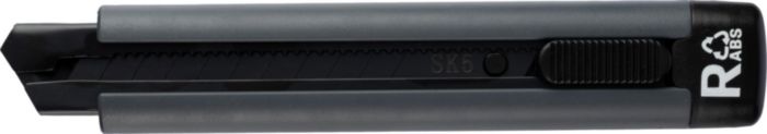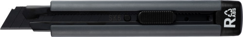 Recycled ABS hobby knife with snap-off blades, including a recycled ABS logo. Individually packaged in a brown carton box.