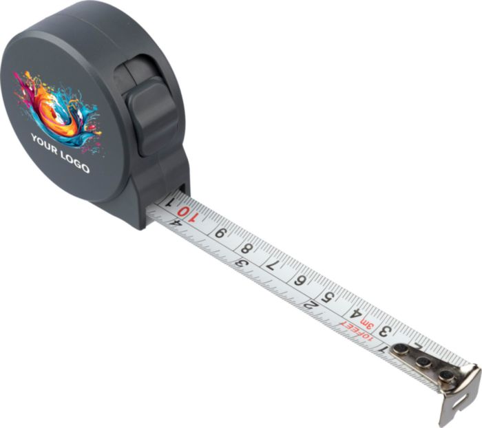 Recycled ABS tape measure (3 meters) with a scale in centimeters and inches. Includes a recycled ABS laser logo. Individually packaged in a brown carton box.