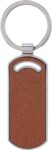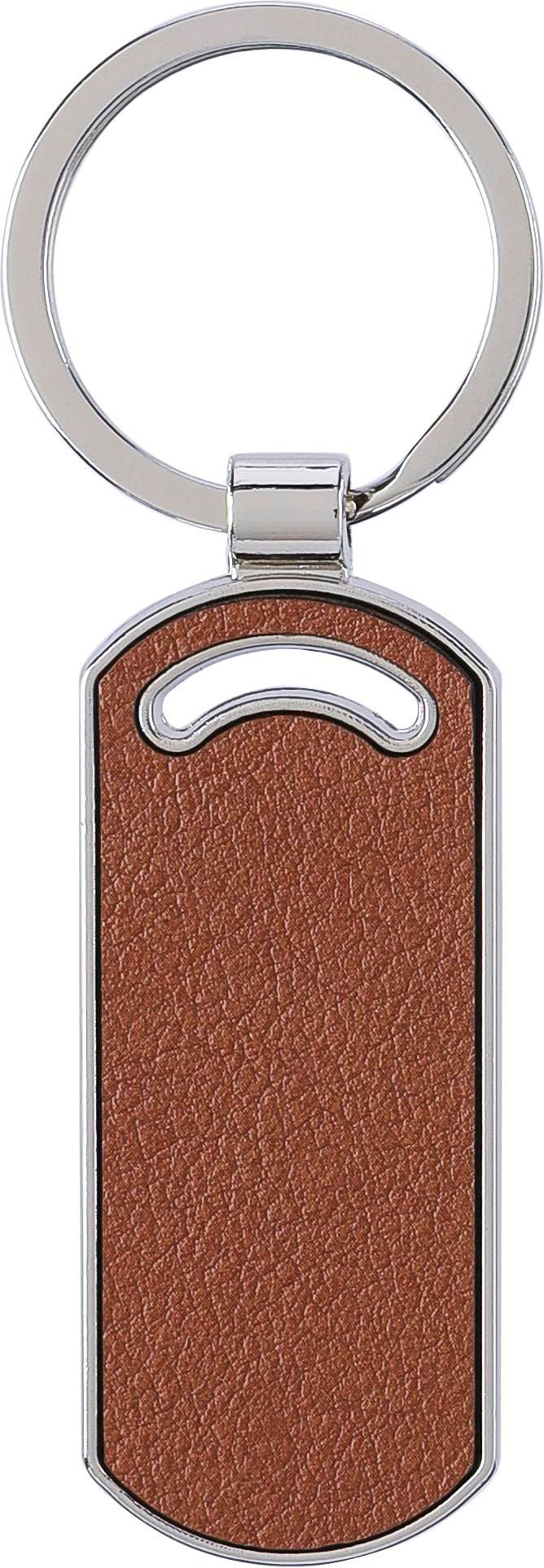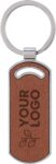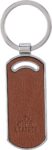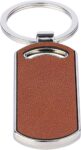 Recycled leather keychain with a metal ring. Oval shape. Includes embossed recycled leather logo on the side. Individually packaged in a brown cardboard sleeve.