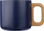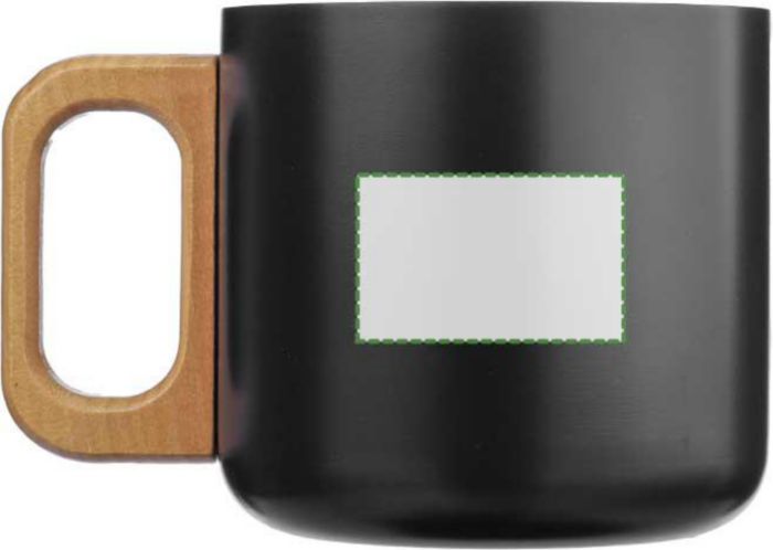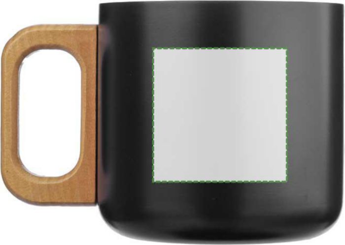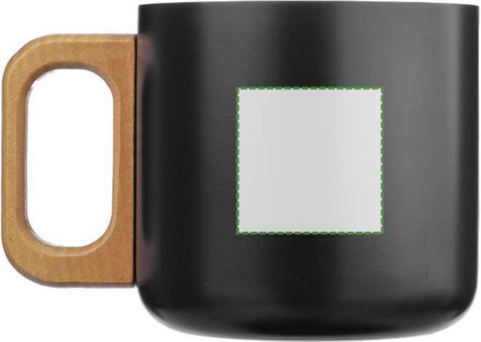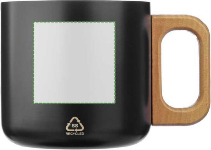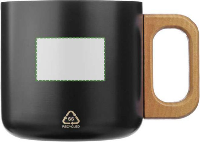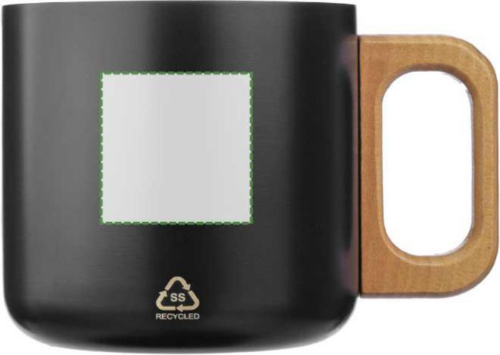 Recycled stainless steel double-walled mug (400 ml) with wooden handle. Not dishwasher safe. Includes an engraved recycled stainless steel logo. Individually packaged in a brown cardboard box.