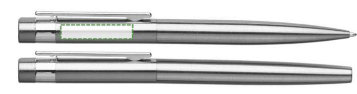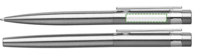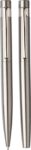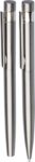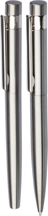 Recycled stainless steel writing set consisting of a twist ballpen and a rollerball pen, both with blue ink. Includes a recycled stainless steel logo on the backside of both pens. Packaged together in a kraft paper gift box.