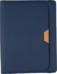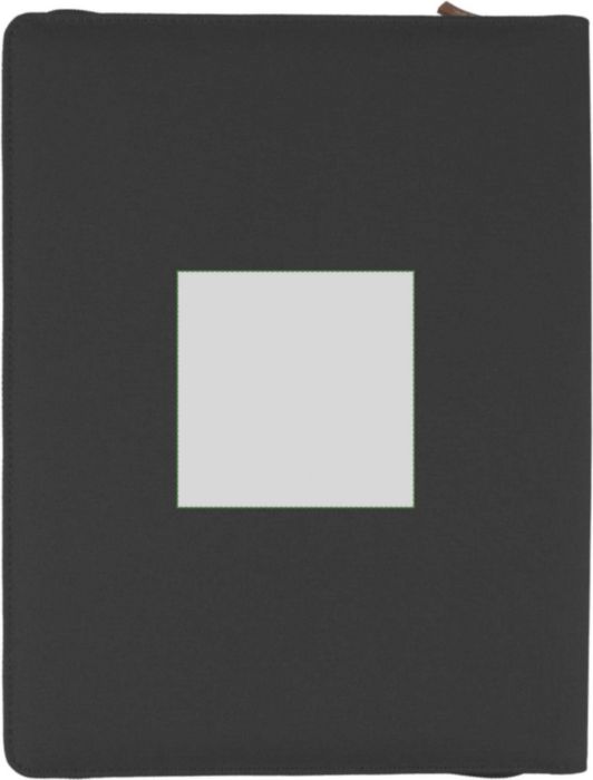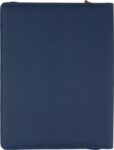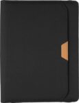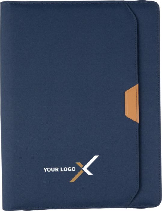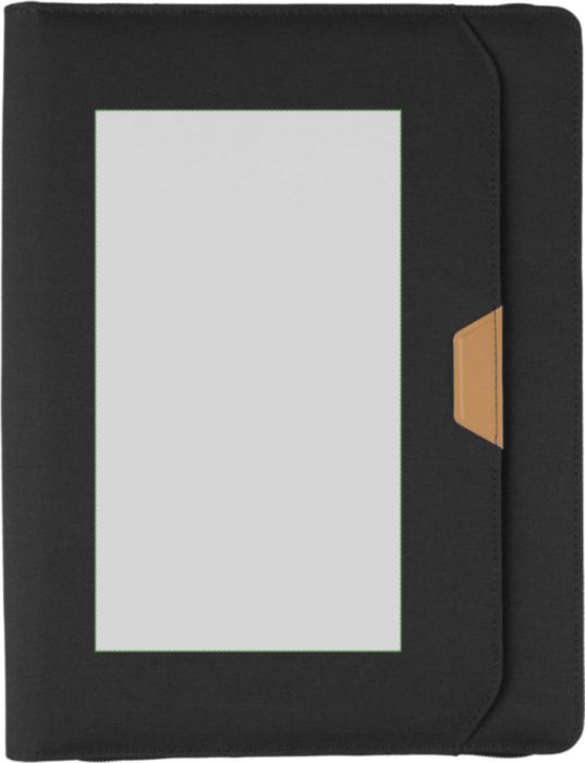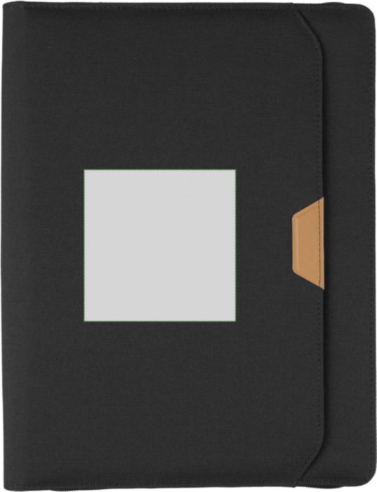 rPET portfolio (approx. A4) with PU detail and zipper. Includes notebook with 20 lined pages (70 gsm), multiple compartments, and a pen loop. Small pocket on the front. Individually packaged in a brown kraft box.