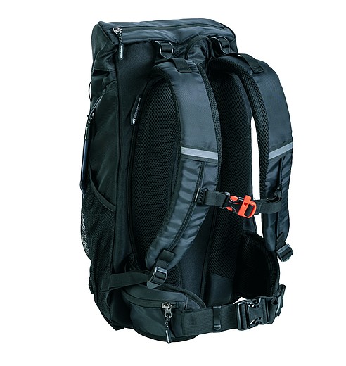 The backpack has many various pockets, for example a zipper pocket on the side, a mesh pocket on the other side and an adjustable chest strap with a whistle.