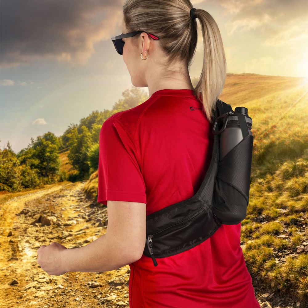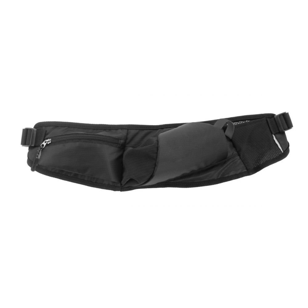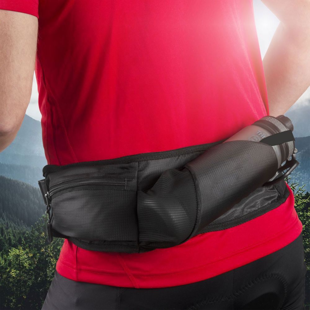 The belt bag includes large front pocket for a sports bottle, small front zipper pocket for a credit card and back zipper pocket with 19 x 10 cm size for a mobile phone.