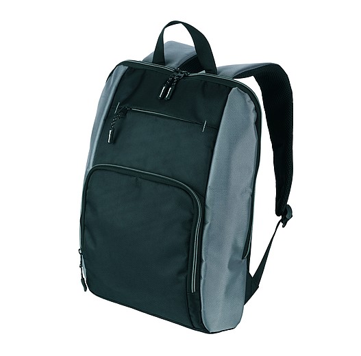 Backpack has two pockets in front side. One of the front pocket includes two bigger and two smaller compartments, two compartments for pens and one mesh pocket with zipper.