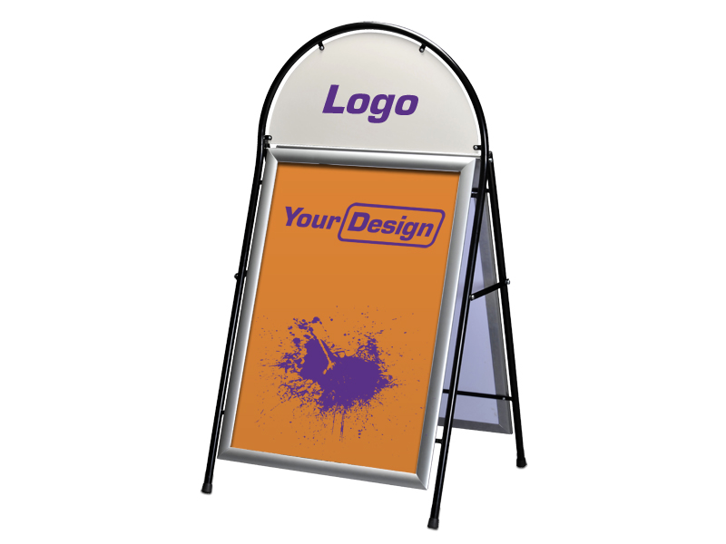 The top model of so called A-racks. Sturdy tubular frame that makes it extra stable. Equipped with two snap frames for simple exchange of posters, and that keeps them in place. Place for logo on the top. Standard sizes are 50 x 70 cm and 70 x 100 cm. The frame is black and the logo plate is whie. Optional standard color of the frames. Delivered 1 pc in a carton.