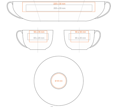 DecorationsTryck på insidan (max: 50x10 mm); Tryck på botten, insida (max: ø40 mm); Tryck på bottens utsida (max: ø30 mm); Kantband; Tryck på fatet (max: 45x45 mm); Kantband på fatet; Namntryck; Guldtryck; Silvertryck; Dekoration runt äggformad yta; Termotryck