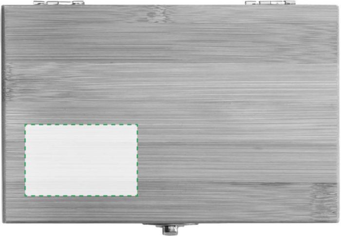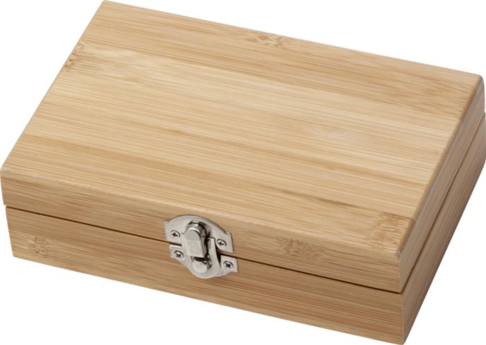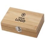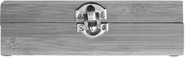 Wine gift set in bamboo box. The items are stainless steel with bamboo accents. Including: corkscrew, wine ring, and stopper.