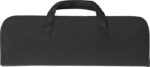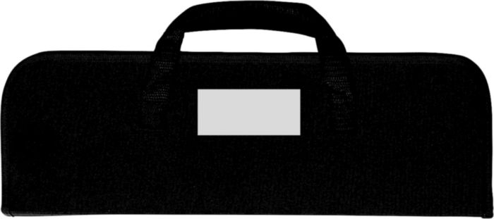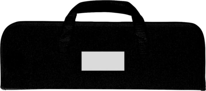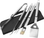 Stainless steel, four-piece barbecue set in a nylon zipper pouch with carrying straps. Including: a long brush, a tong, a meat fork, and a spatula.