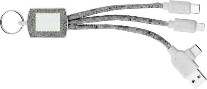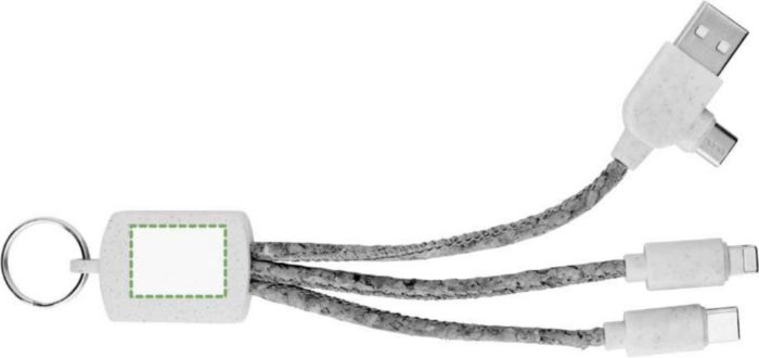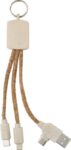 Stainless steel keychain with charging cable . Cork cable and wheat straw sockets. 3 cables, one USB-A/C, one lightning, one USB-C. Individually packaged in a brown cardboard pouch.