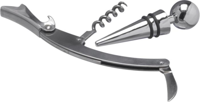 Stainless steel wine set, with a metal waiter’s knife and bottle stopper. Packaged in a black gift box.