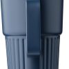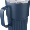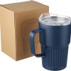 Recycled stainless steel double-walled drinking mug (450 ml). The interior is made of stainless steel 304 and the exterior is stainless steel 201 with a ridge grip and sturdy handle. Features an AS lid with a slide closure. Includes an engraved recycled logo on the body. Individually packaged in a brown cardboard box.