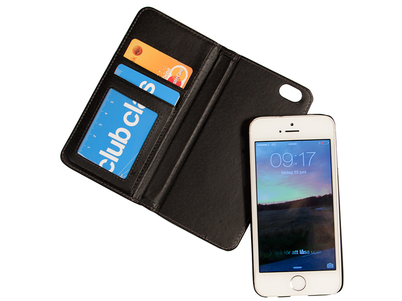 Mobile phone case in genuine leather with three card pockets. The back of the inner shell has a magnet that holds the phone in place.