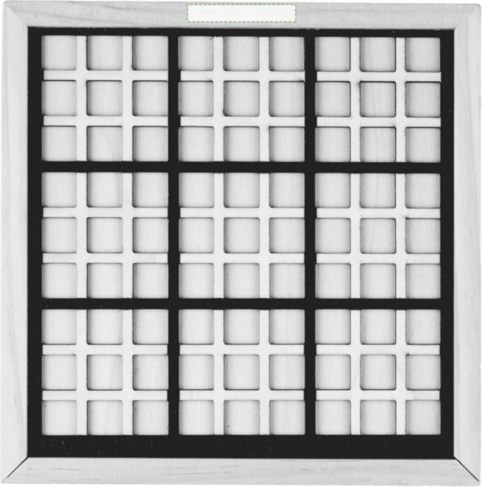 Wooden Sudoku game. Includes 99 numbered wooden chips and a manual with playing instructions and solutions. Individually packaged in a brown carton box.