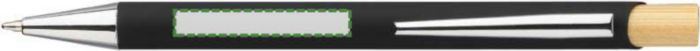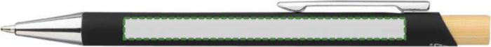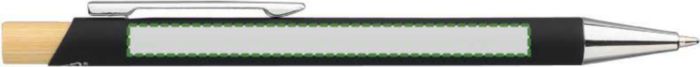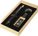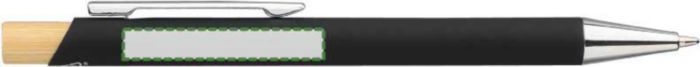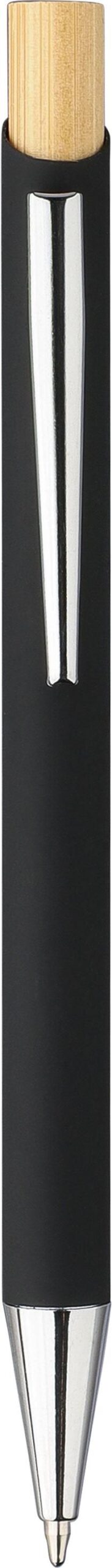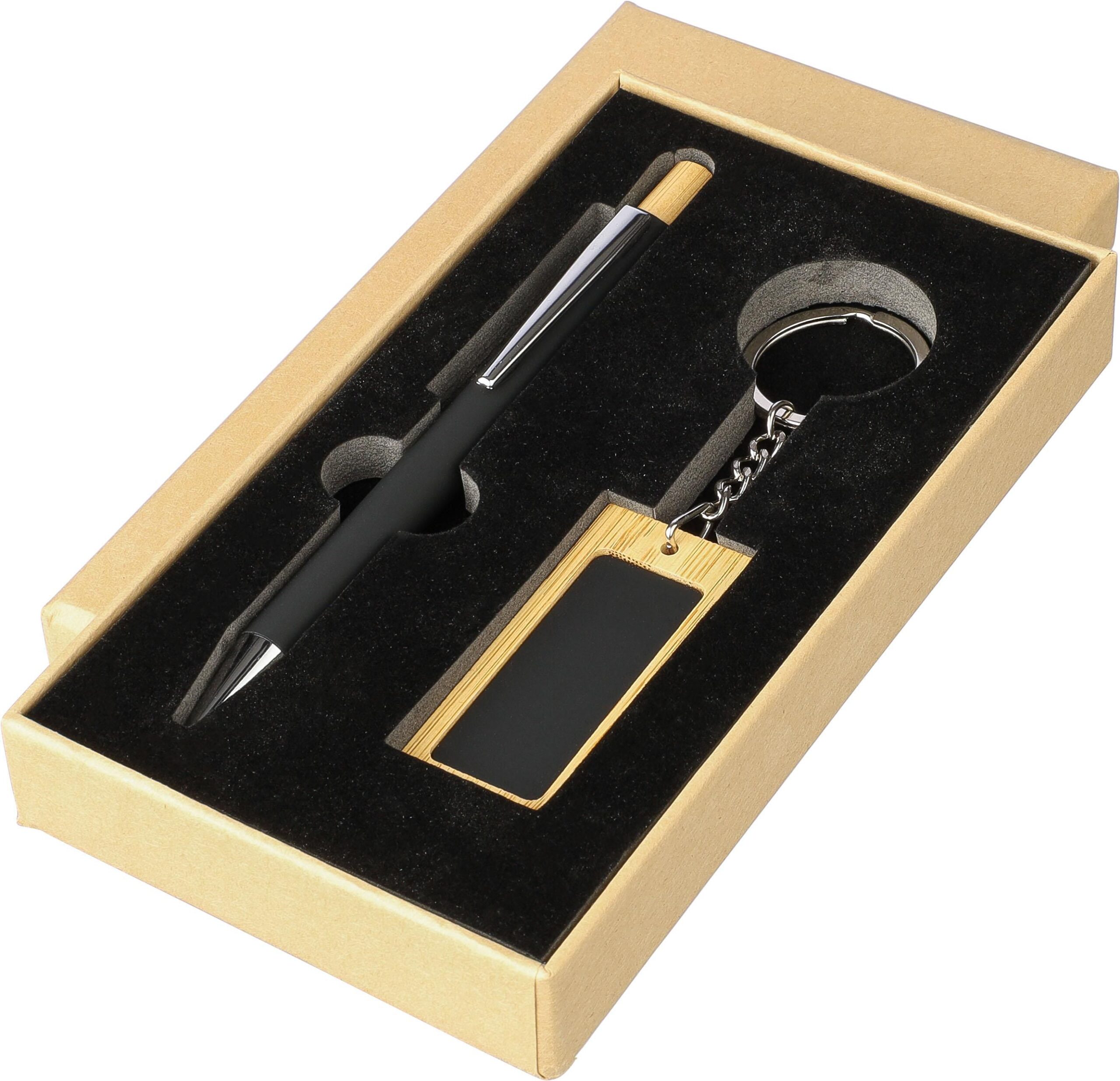 Bamboo writing set consisting of a bamboo and rubberized recycled aluminium ballpen with blue ink. Featuring a bamboo push button and chromed plastic tip, and a bamboo and rubberized stainless steel rectangular keychain. Both items reveal a mirror effect after laser engraving and include a recycled aluminium logo. Packed in a kraft paper box with velvet inlay.