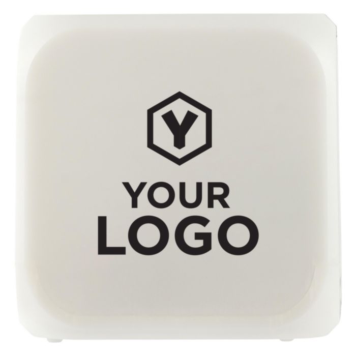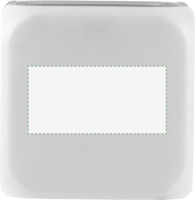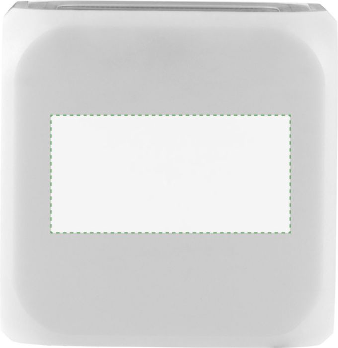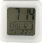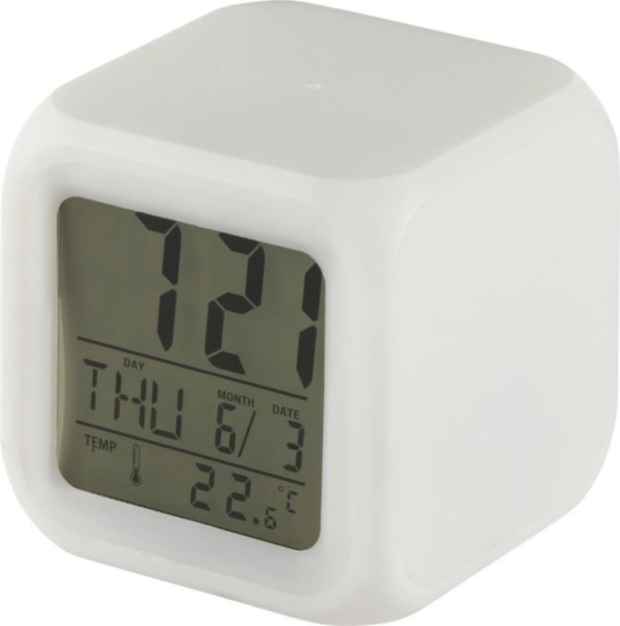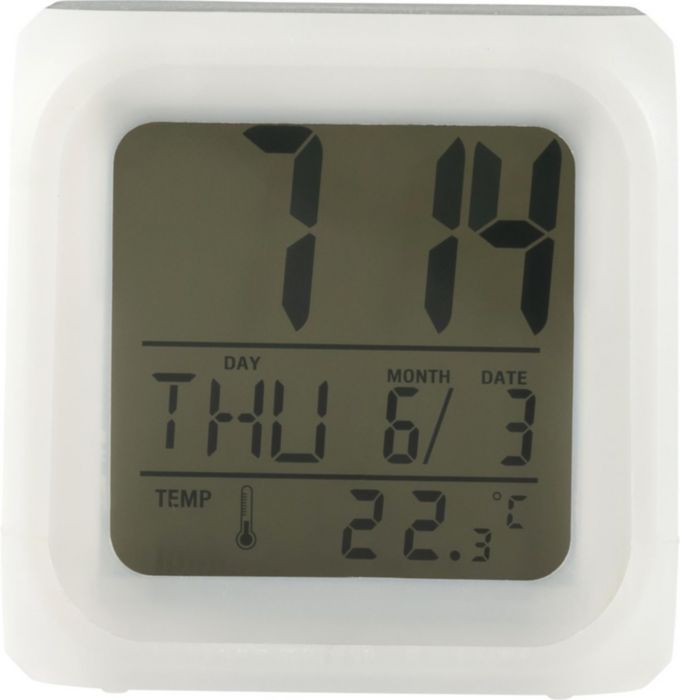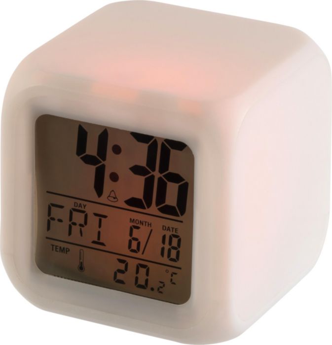 HIPS kubformad alarmklocka som ändrar färg. Visar tid, veckodag, datum och temperatur. Batterier ingår.