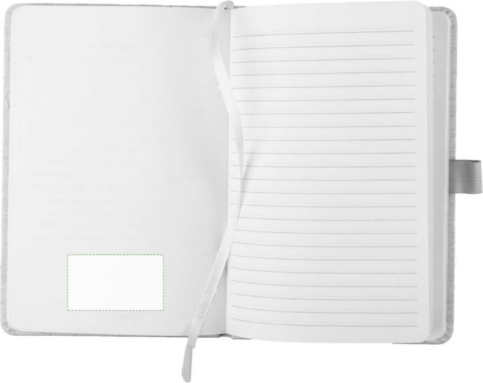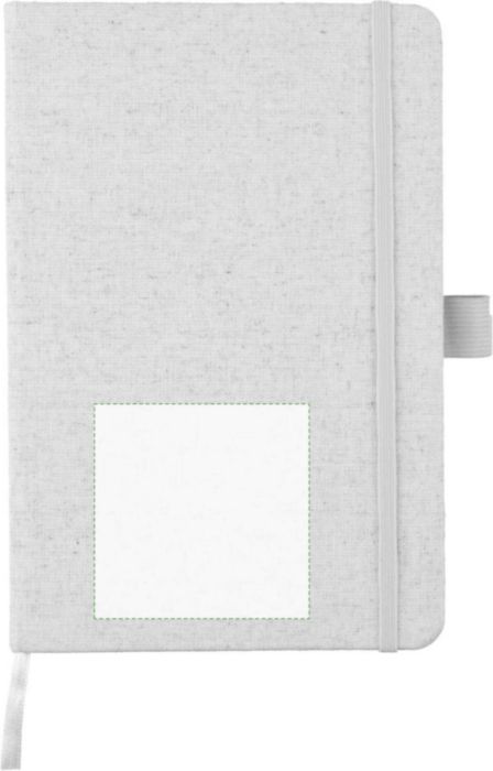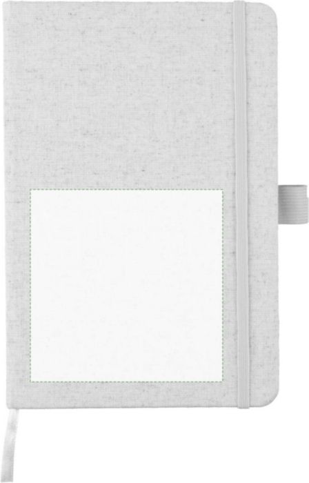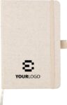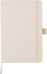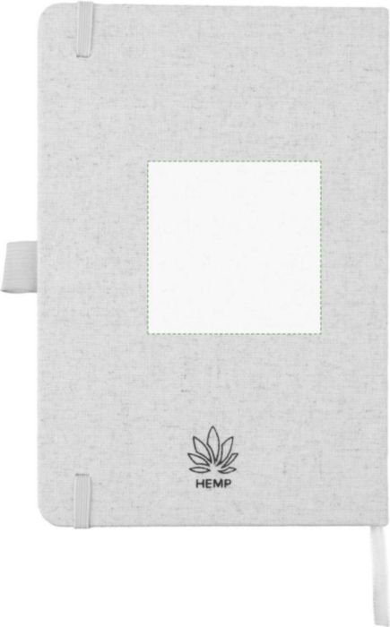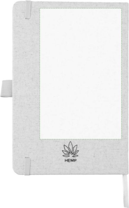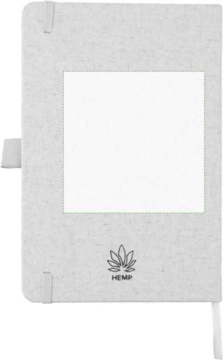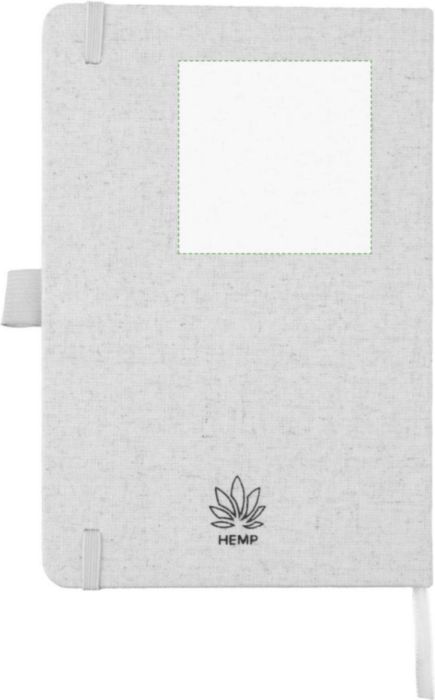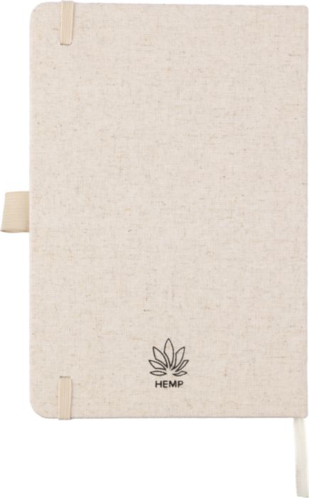 Anteckningsbok (ca A5) med 80 sidor (70 gsm) av hampa, med pennögla, elastiskt band och band i matchande naturlig färg. Inkluderar en hampasymbol på baksidan av omslaget.