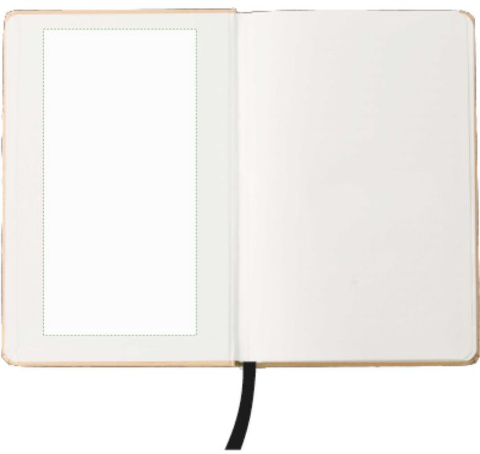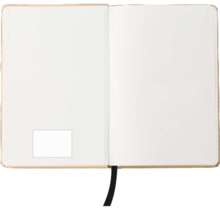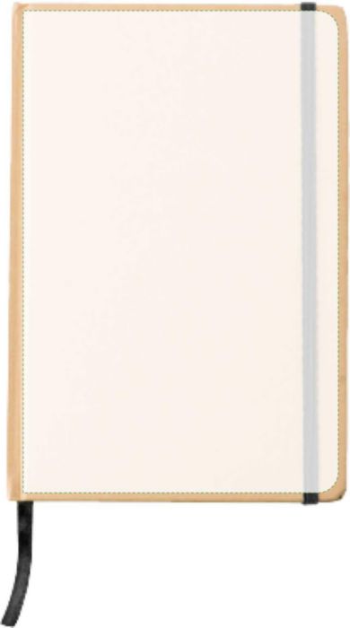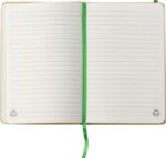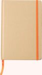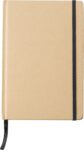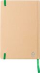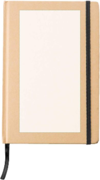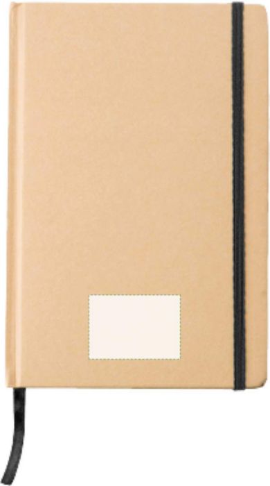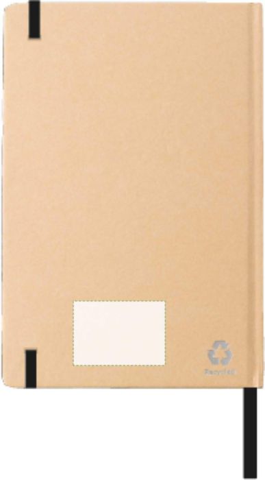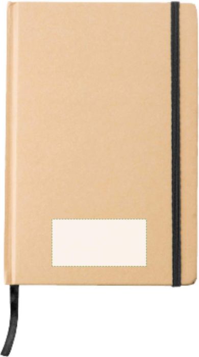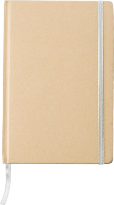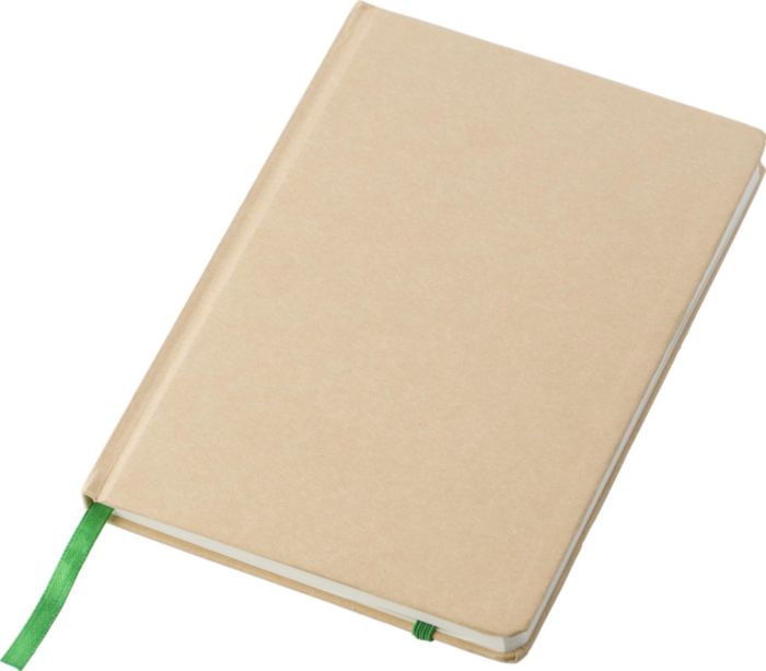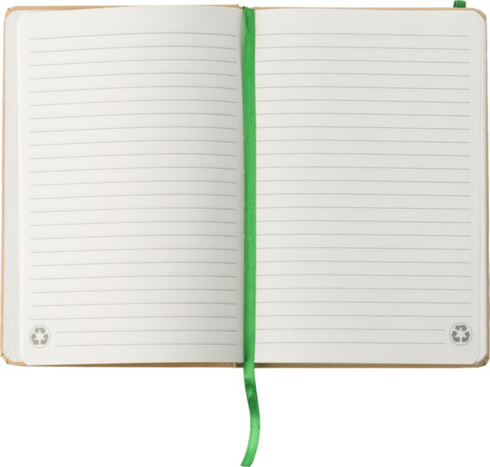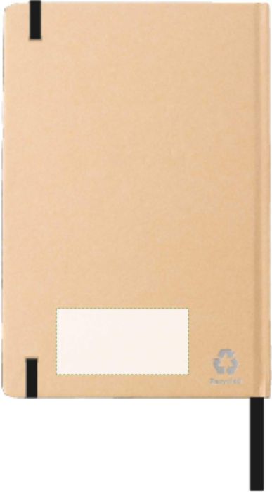 Anteckningsbok i återvunnen kartong (A5) med 160 linjerade sidor. Med resårband och band som bokmärke.