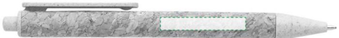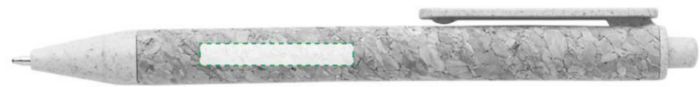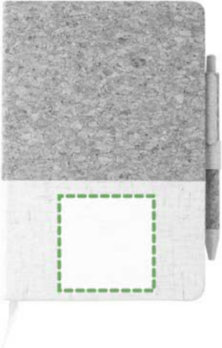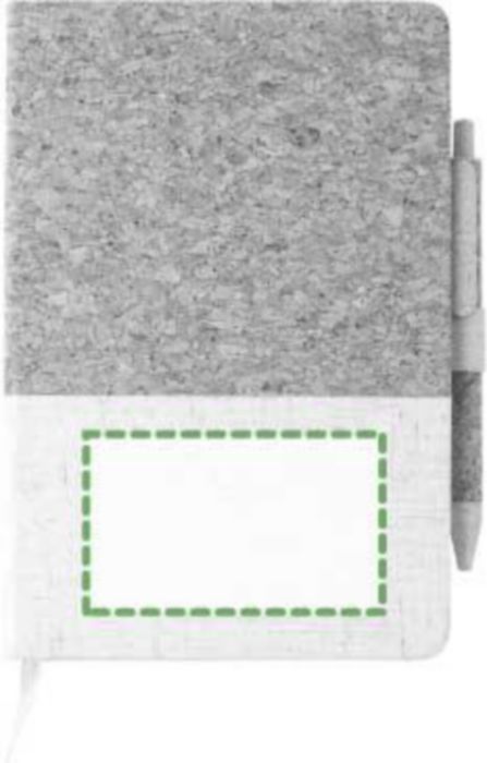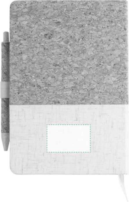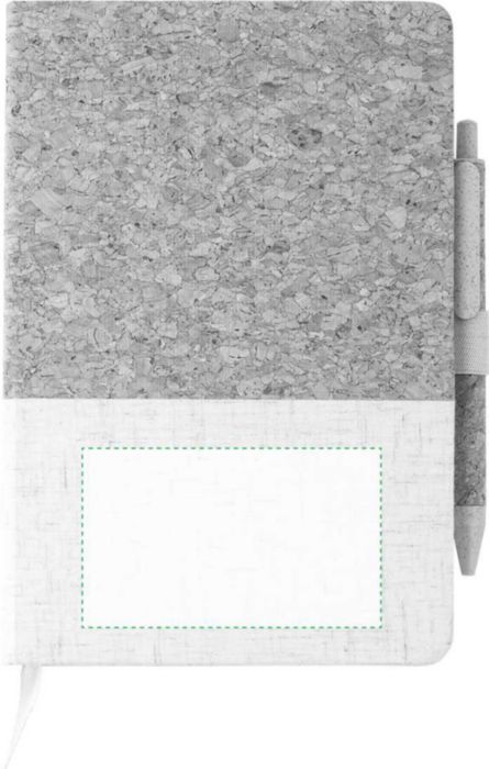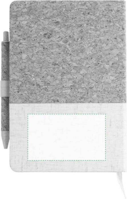 Antecknignsbok i kork och linne med kulspetspenna av vetestrå. Levereras i ask av kraftpapper. Elastisk ögla för pennan samt 80 linjerade blad med plats för datum. Pennan har blått bläck.