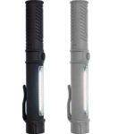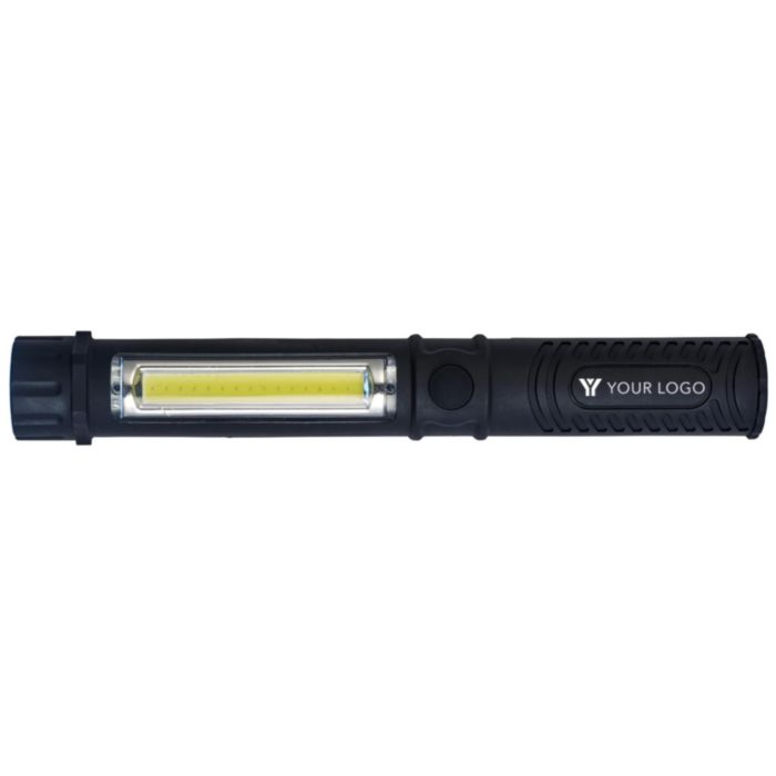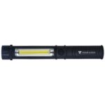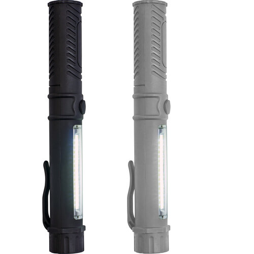 Arbets-/ficklampa i plast med kraftfull COP-lampa i toppen och sidan. Batterier ingår.