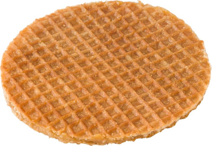 Åtta traditionella holländska waffels; dubbla kakor med karamellfyllning i mitten, packade i plastpåse. Genom att lägga kakan på en kopp med varm dryck, smälter fyllningen och kakan blir extra delikat och god.