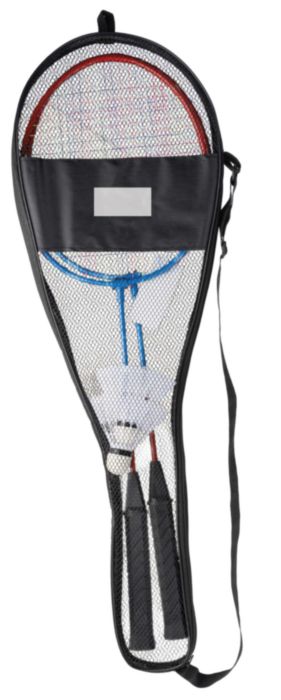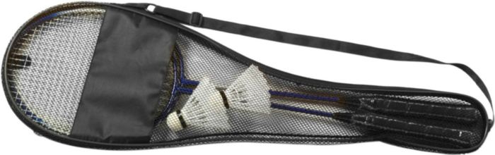 Badmintonset i nylonfodral med två racketar och två badmintonbollar.