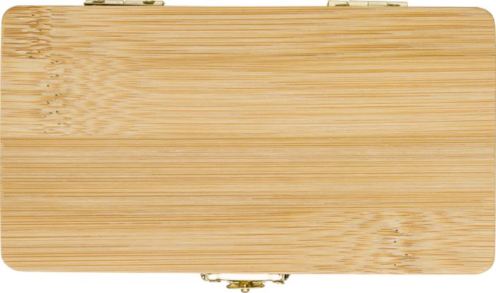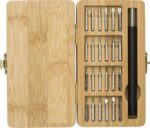 Verktygssats av bambu med 25 delar. 24 bits och en hållare. Individuellt förpackad i en brun kartonglåda.